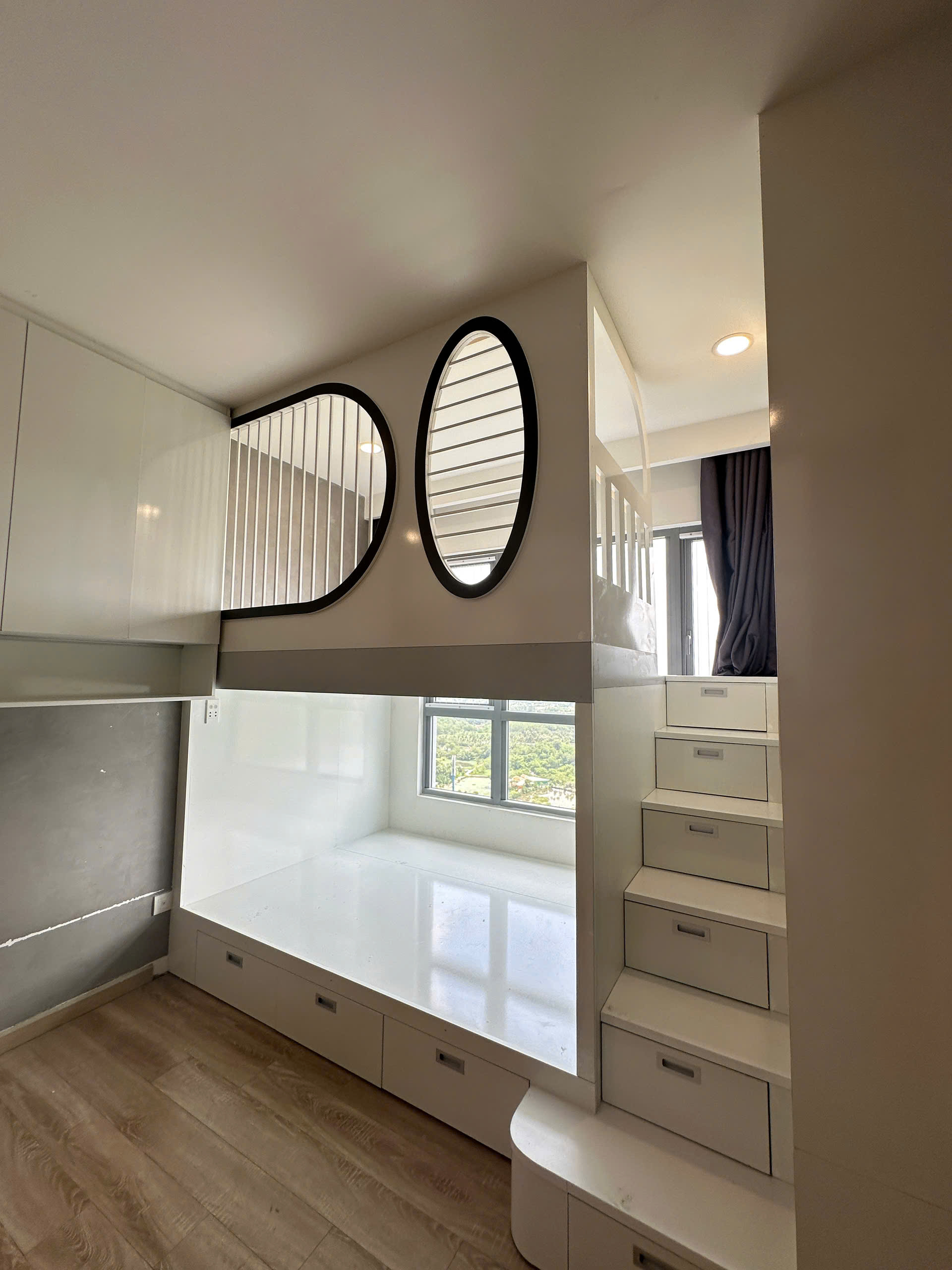 - Một phòng trẻ laminate tone pastel xanh – trắng thi công trong 5 ngày, dễ sạch, không mùi sơn.